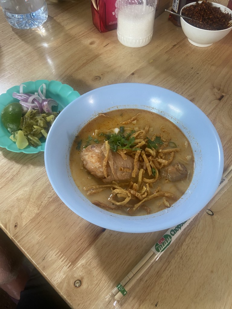 If you are looking for a dish that is rich, slightly spicy but so moreish, then you have to try Khao Soi. This dish originates in Chiang Mai and there is an array of Michelin rated Khao Soi restaurants you can try. You may be worried that it is out of your budget being Michelin rated, but, I managed to grab a bowl of Khao Soi for £1.30.